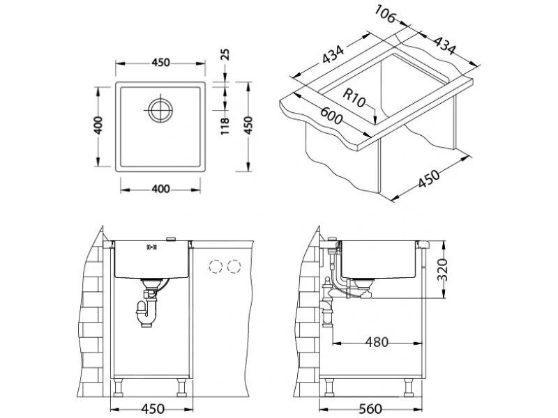 - afmetingen van de spoelbak400 x 400 x 200 mm