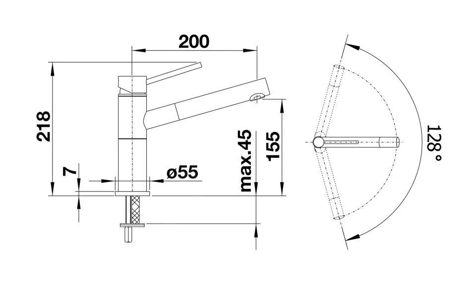- mechanisme geeft de mogelijkheid om de kraan uit te trekken en opzij kantelen
