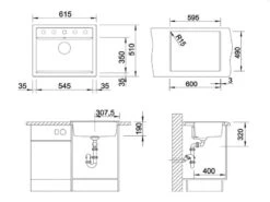 De toale afmeting van de spoelbak is 615 x 510 mm. De afmeting van de spoelbak zelf is 545 x 350 mm. De diepte van de spoelbak is 190 mm. De onderkast moet 600 mm breed zijn.