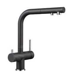 Vind je een gezonde levensstijl belangrijk? Dan mag deze Blanco Fontas S II keukenkraan in je keuken niet ontbreken. Hij biedt standaard warm en koud water én bovenop gefilterd kraanwater. Hierdoor ben je zeker dat je zuiver, vers water zonder chloor en andere ongewenste stoffen drinkt. De keukenmengkraan is gemaakt in de Silgranit Look in de moderne antraciet afwerking met chromen details, waardoor hij perfect past bij elke zwarte silgranit spoelbak. Rechts op de kraan vind je een bedieningshendel voor het mengen van koud en warm water, terwijl links zit er een draaihendel voor gefilterd water. De spoelbakkraan heeft aparte leidingen voor gefilterd en ongefilterd water om mee af te wassen. Bovenop is het kraantje uitgerust met een praktische uittrekbare handdouche voor optimale bewegingsvrijheid. Deze keukenkraan wordt gewoonweg een onmisbaar onderdeel van je keuken!