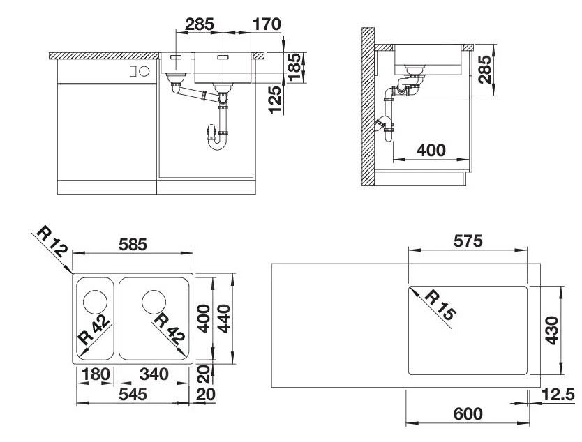 - afmetingen kleine spoelbak: 180 x 400 x 125 mm (LxBxD)