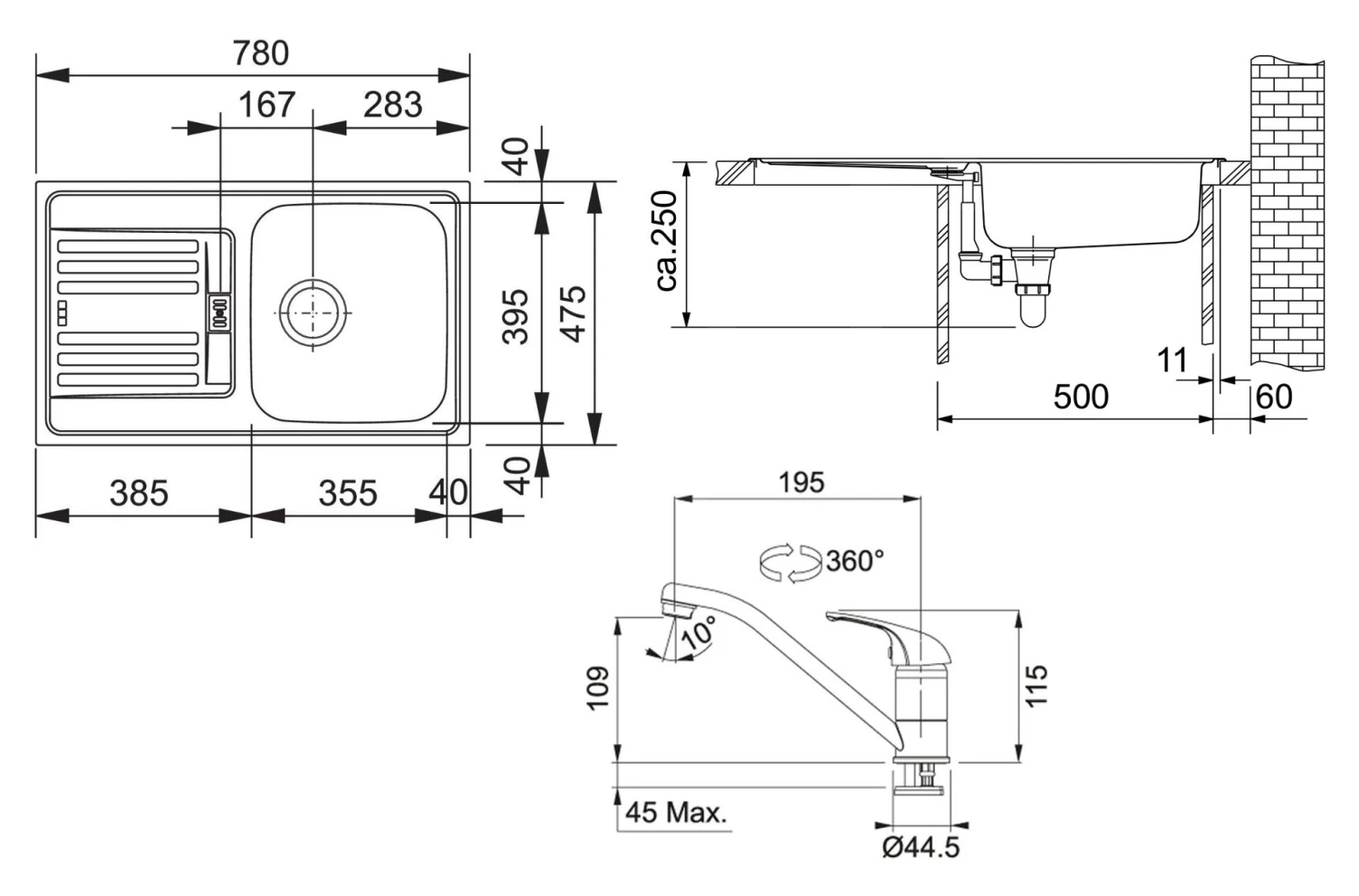 - Spoelbak: 355 × 395 × 150 mm