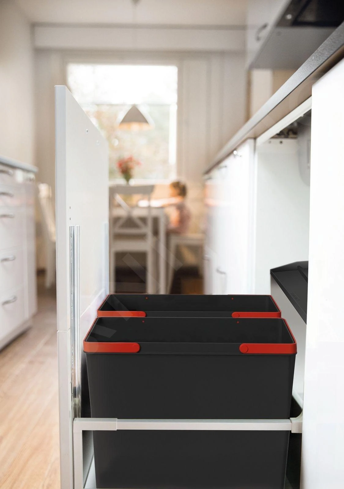 - de afvalbakken worden in de behuizing met volledig uittreksysteem geplaatst