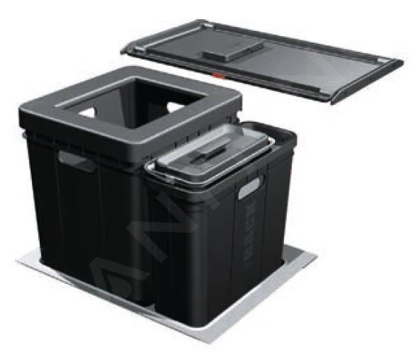 De afvalemmers uit 350, Trolley Vario en Easysort serie worden geplaatst in een behuizing met uittrekmechanisme. De behuizing is voorzien van een reling en hoge zijwand. Voor deze afvalemmers raden wij de volledig uittrekbare systemen Blum, Grass of Hettich aan.