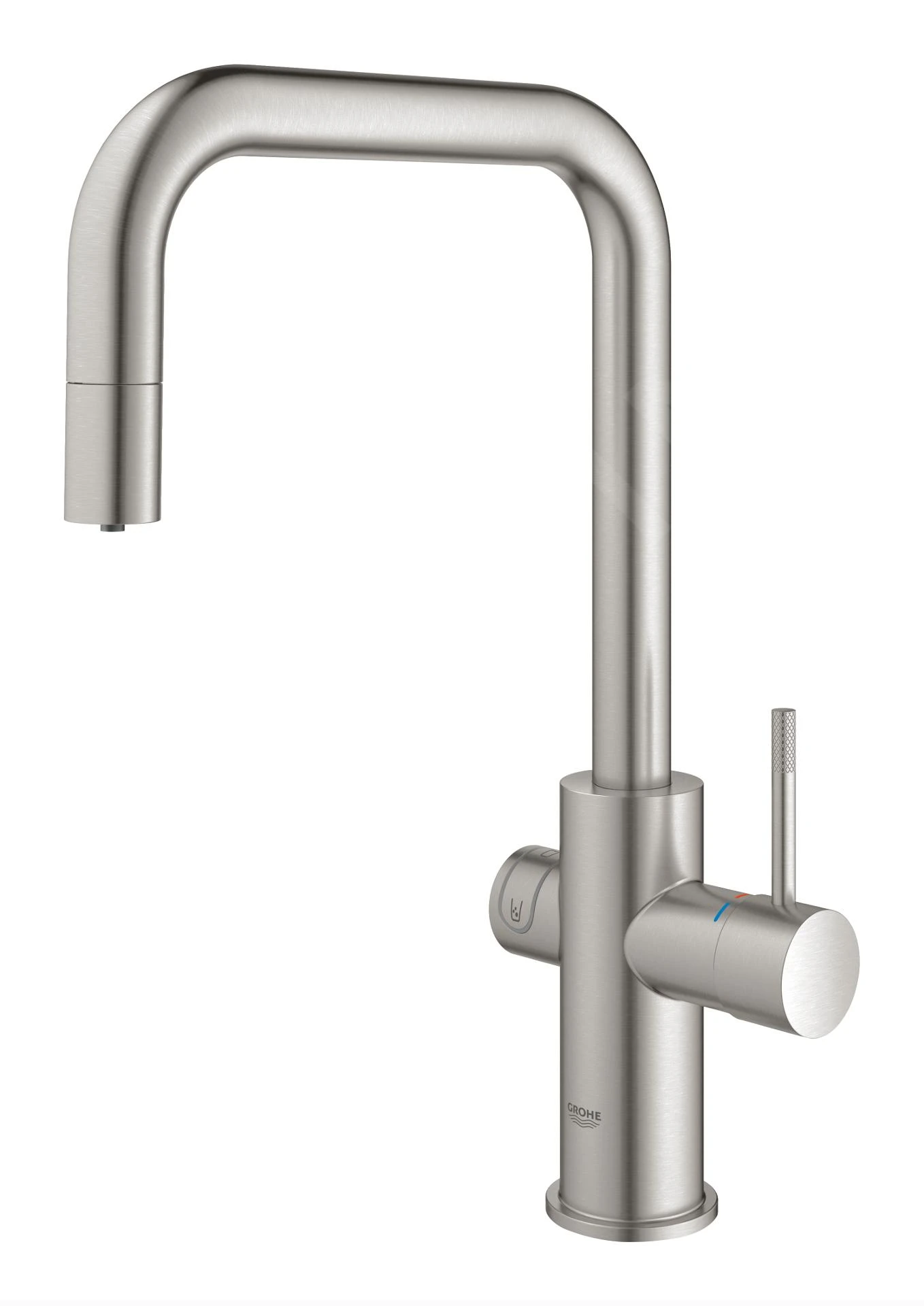 De keukenkraan is afgewerkt in de stijlvolle, krasbestendige supersteel afwerking, waardoor hij een ideale toevoeging aan elke moderne keuken is. Bovenop is hij uitgerust met een uittrekbare sproeikop, is 360° draaibaar en voorzien van een extra hoge uitloop voor ultiem gebruiksgemak. Een duurzame GROHE SilkMove keramische kardoes voor een soepele bediening mag natuurlijk niet ontbreken. Geef je keuken deze slimme oplossing van GROHE en geniet van zuiver gefilterd water direct uit je keukenmengkraan!