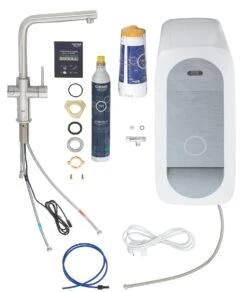 De set is klaar voor direct gebruik en omvat namelijk een GROHE Blue keukenkraan, een koeler met een laag energieverbruik, een filter en een CO2-fles. De koeler is compact en past in elke onderkast dat meer dan 30 cm breed is.