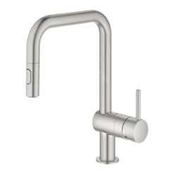Maak kennis met deze fraaie GROHE Minta keukenkraan van GROHE met uittrekbare handdouche. De moderne minimalistische lijnen samen met de originele supersteel afwerking zorgen voor een stoere look. De unieke U-uitloop biedt genoeg ruimte om in de spoelbak te werken en tegelijkertijd grote containers eenvoudig te vullen. Je zult vast ook de mogelijkheid waarderen om de uitloop 360° te draaien. Andere praktische aanvulling is de uittrekbare sproeikop met een schakelaar waarmee je tussen twee straalsoorten traploos kunt schakelen: namelijk tussen een standaard straal en de SpeedClean douche. En dankzij het GROHE EasyDock magnetisch oprolsysteem keert de handdouche altijd soepel terug.