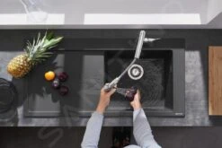 - de slang kan tot wel 76 cm worden uitgetrokken en zorgt voor meer comfort en een grotere actieradius bij de spoelbak