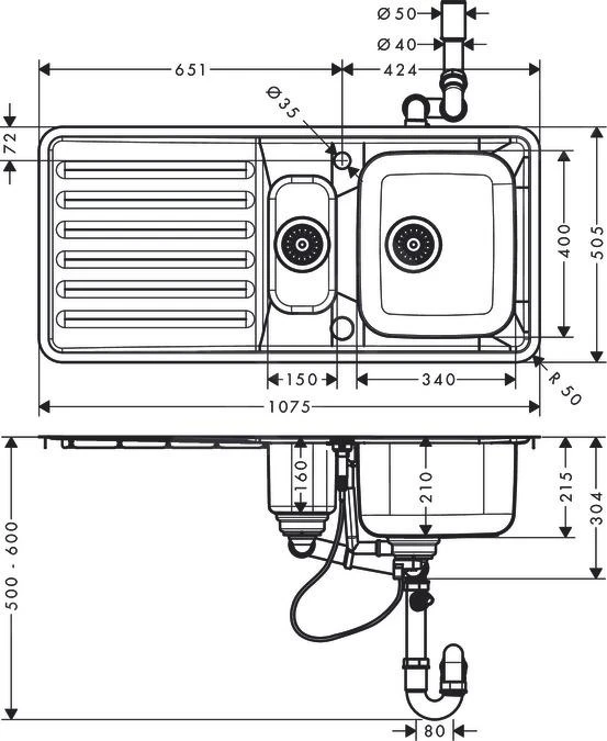 Inbouwspoelbak 340/150/400 met afdruipgedeelte