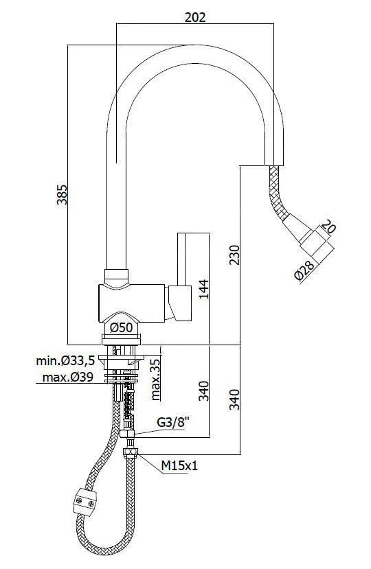 - set van 2 roestvrijstalen slangen G 3/8″ voor aansluiting op hoekstopkranen met een lengte van 45 cm