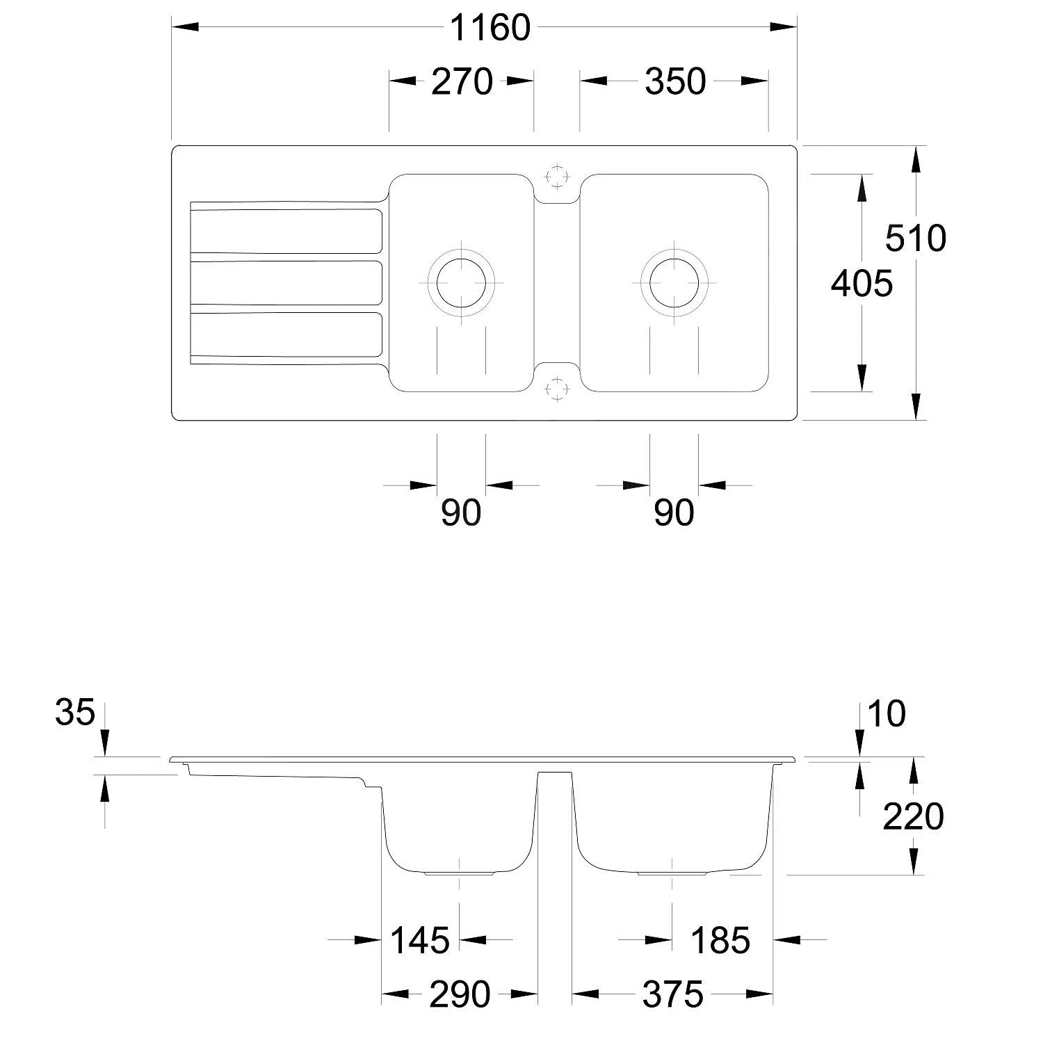 - totale afmetingen dubbele spoelbak: 1160 x 510 mm